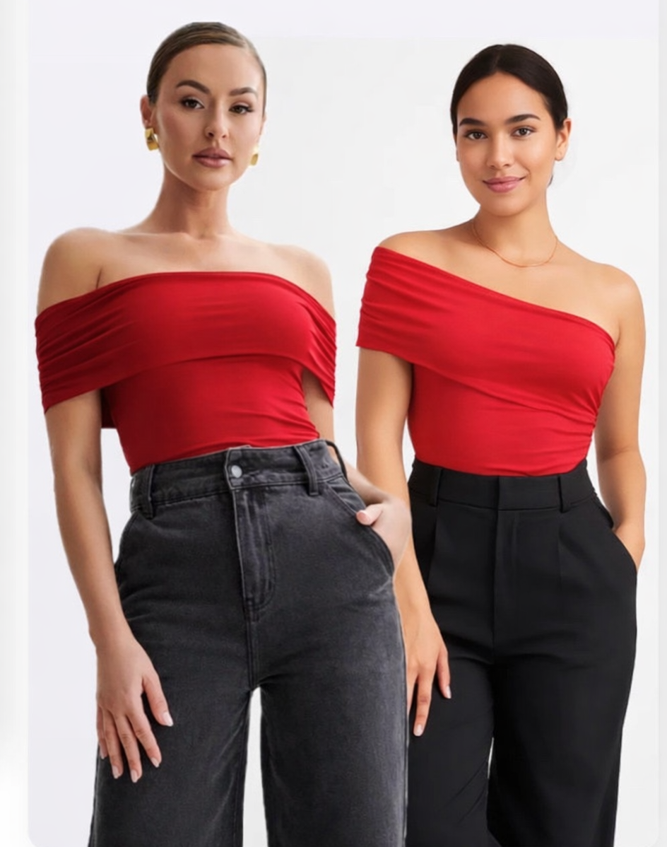 Esta referencia puedes usarla de dos formas: estilo cuello bandeja o dejando un hombro descubierto. En las fotos te mostramos las dos formas de ponerlo.